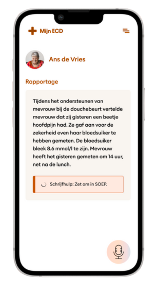 Met spraakgestuurd rapporteren kunnen medewerkers hun verslag direct inspreken via de Nedap Ons-app in combinatie met Attendi. Dit maakt rapporteren sneller en zorgt voor actuele informatie in het dossier. Minder typen betekent meer tijd voor de bewoner en kan bijdragen aan werkplezier. De techniek sluit aan bij onze ambitie om administratieve lasten te verlagen en zorg slimmer te organiseren.