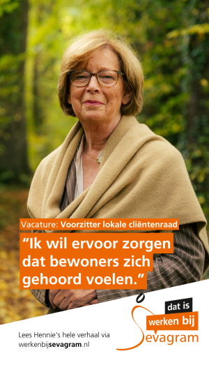 Toen haar vader achttien jaar geleden bij Sevagram kwam wonen, raakte Hennie van Bodegom diep onder de indruk van de warmte en betrokkenheid binnen de zorglocatie De Regenboog. “Ik werd er altijd hartelijk ontvangen. De medewerkers leefden echt met me mee.” Na haar pensioen besloot ze niet stil te zitten en zich in te zetten als lid van de cliëntenraad. Inmiddels is ze voorzitter van de raden van De Regenboog en Elfershof in Heerlen. “Het voelde als een mooie invulling van mijn vrije tijd én als een manier om iets terug te doen.” Per 1 januari 2026 loopt de termijn van Hennie als voorzitter af. Daarom zoekt Sevagram nieuwe, enthousiaste mensen die zich willen inzetten als voorzitter van de lokale cliëntenraad.