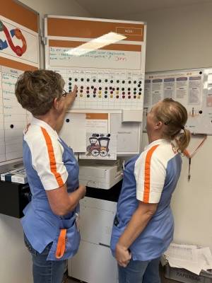 Het bord is opgebouwd uit negen vlakken, waarin per student de naam, opleiding en het leerjaar zichtbaar zijn. Met magnetische kaartjes worden veelvoorkomende handelingen en werkprocessen weergegeven, zoals ADL, wondzorg, MDO en artsenvisite. De voortgang wordt weergegeven via een kleurcode (zwart, rood, geel en groen). Studenten zijn zelf verantwoordelijk voor het bijhouden van hun voortgang, wat eigenaarschap stimuleert en hen actief betrekt bij hun ontwikkeling.