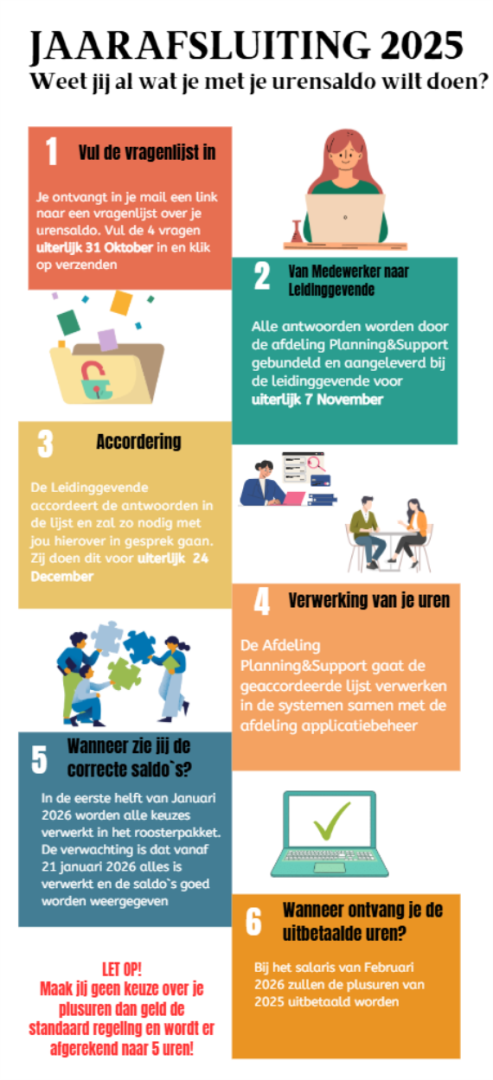 - Alle medewerkers ontvangen binnenkort een link naar een vragenlijst waarin de keuze kenbaar gemaakt kan worden wat zij met hun uren willen doen (vóór 31-10-2025).