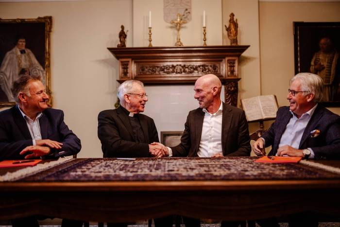 Van links naar rechts: Jean-Pierre Halmans (Lid Raad van Bestuur Sevagram), Mgr. Dr. Jan Vries (Voorzitter van het Kerkbestuur/pastoor), Pim Steerneman (Voorzitter Raad van Bestuur Sevagram), Alex Jaminon (Vicevoorzitter Kerkbestuur/penningmeester)
