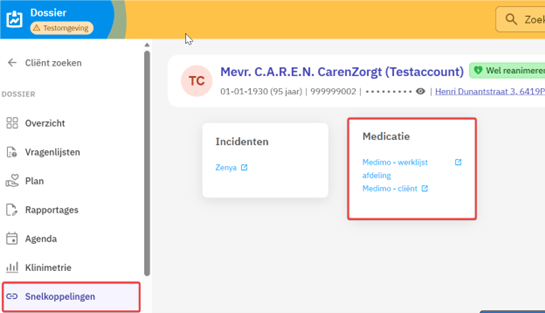 Hier zie je rechts naast het kopje met de link naar Zenya de linkjes naar Medimo. Hierbij heb je de keuze uit 2 linkjes:
