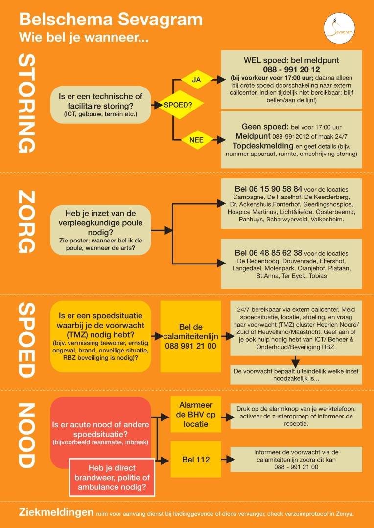 Op onderstaande poster kun je in één oogopslag zien wie je moet bellen in verschillende situaties, zoals bij een technische storing, een spoedsituatie, wanneer je de RBZ nodig hebt, of bij een reanimatie of inbraak. Daarnaast vind je op het belschema de telefoonnummers van de verpleegkundige poule.